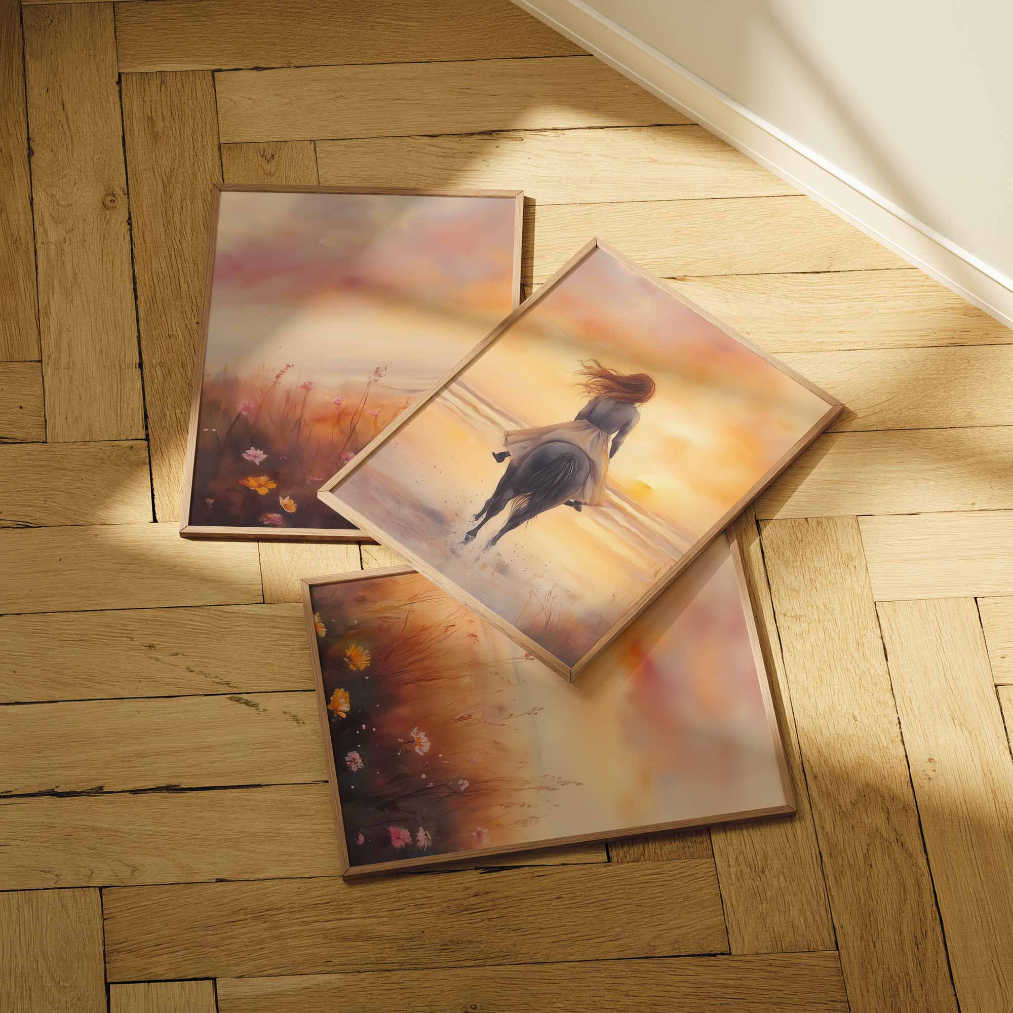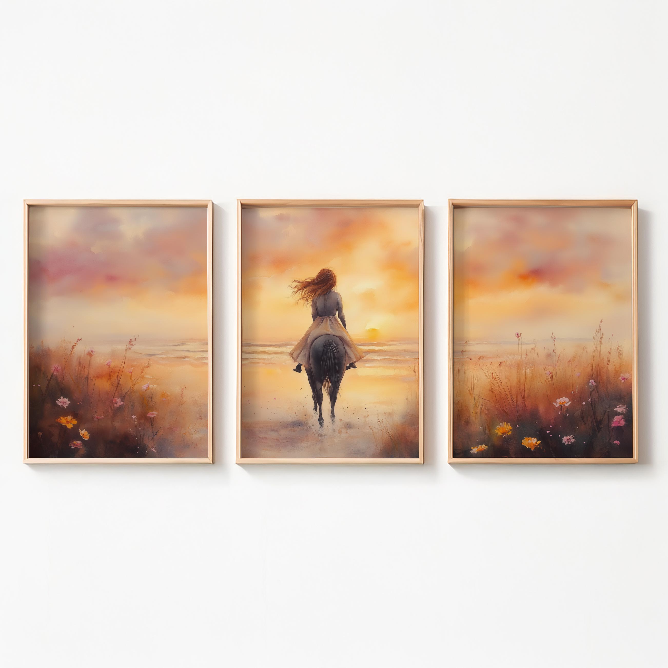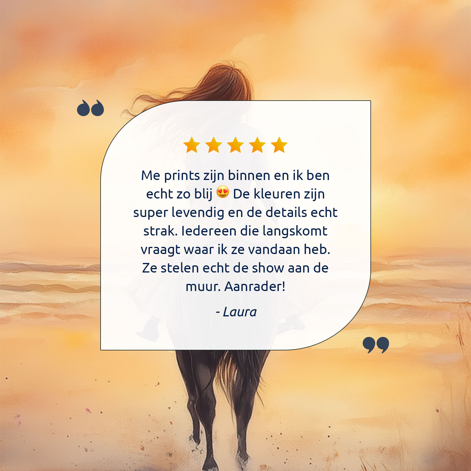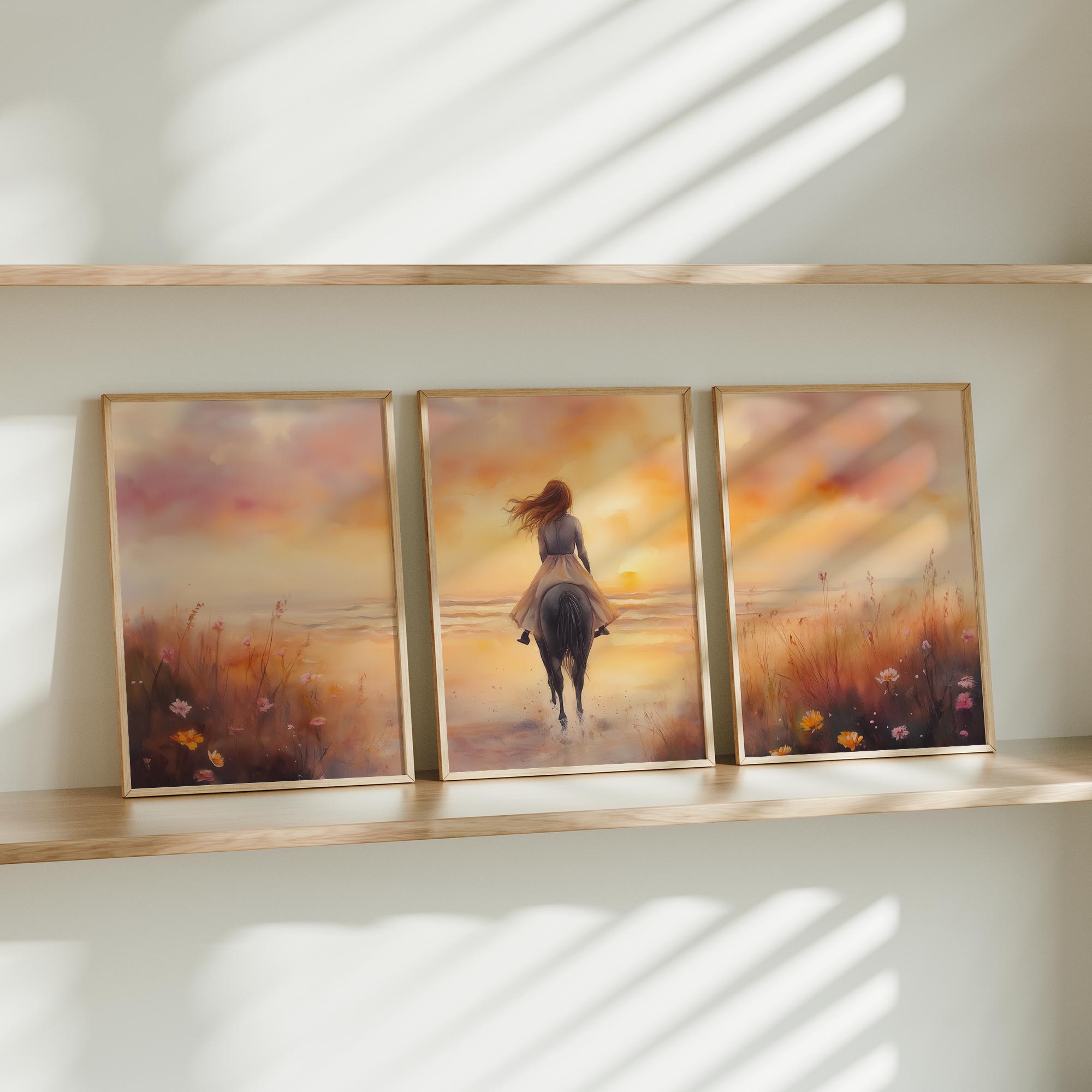 Zonsondergang op het strand met paard en droommeisje