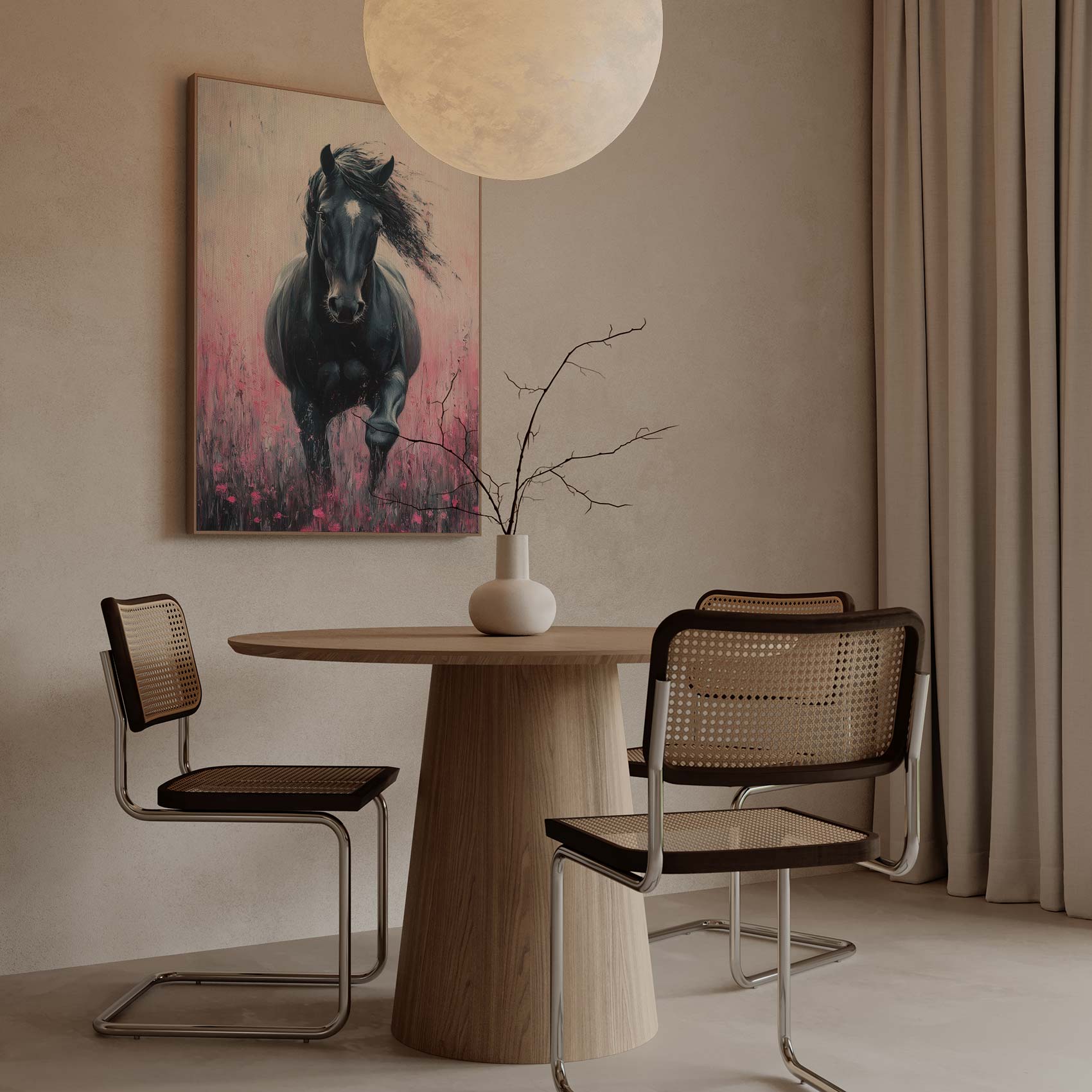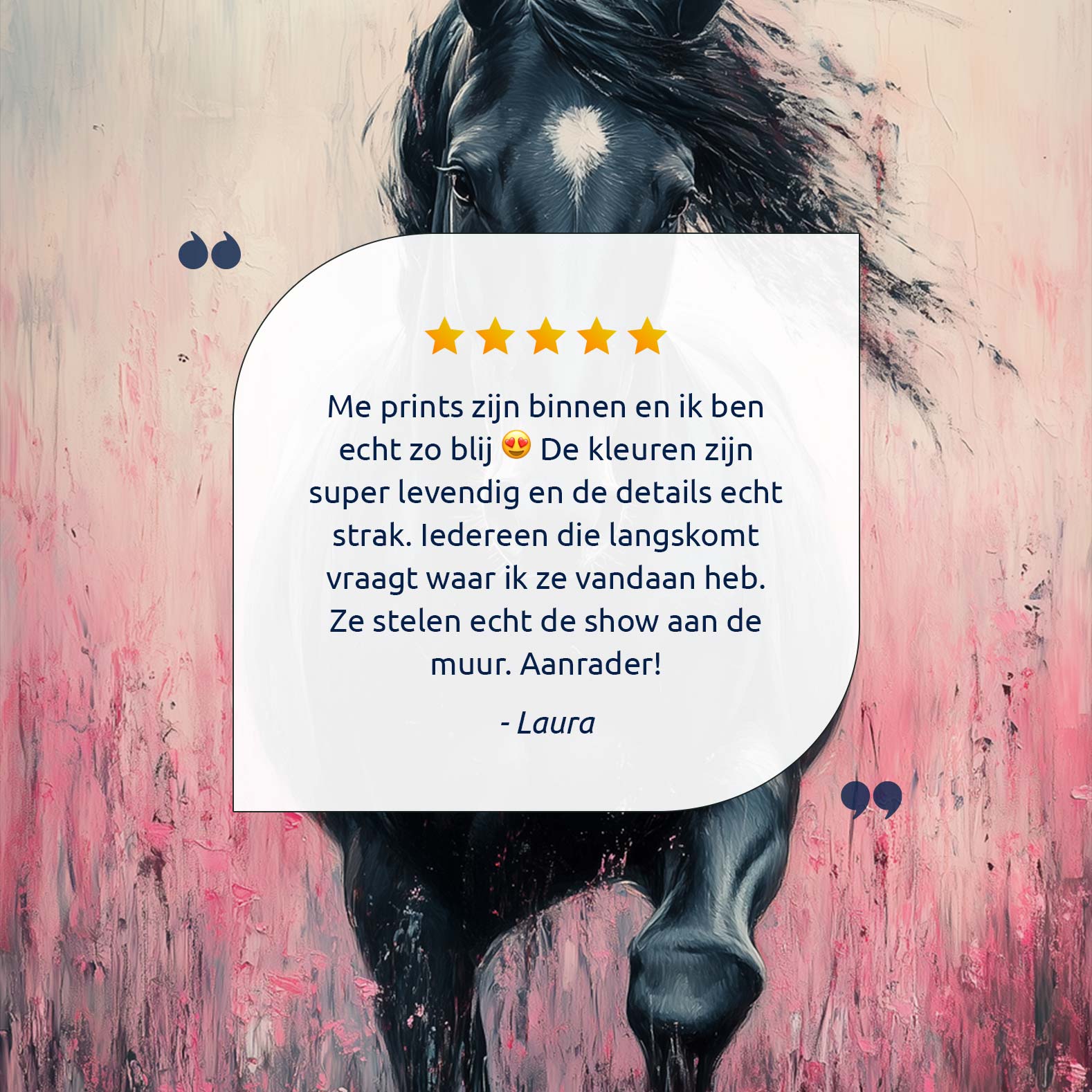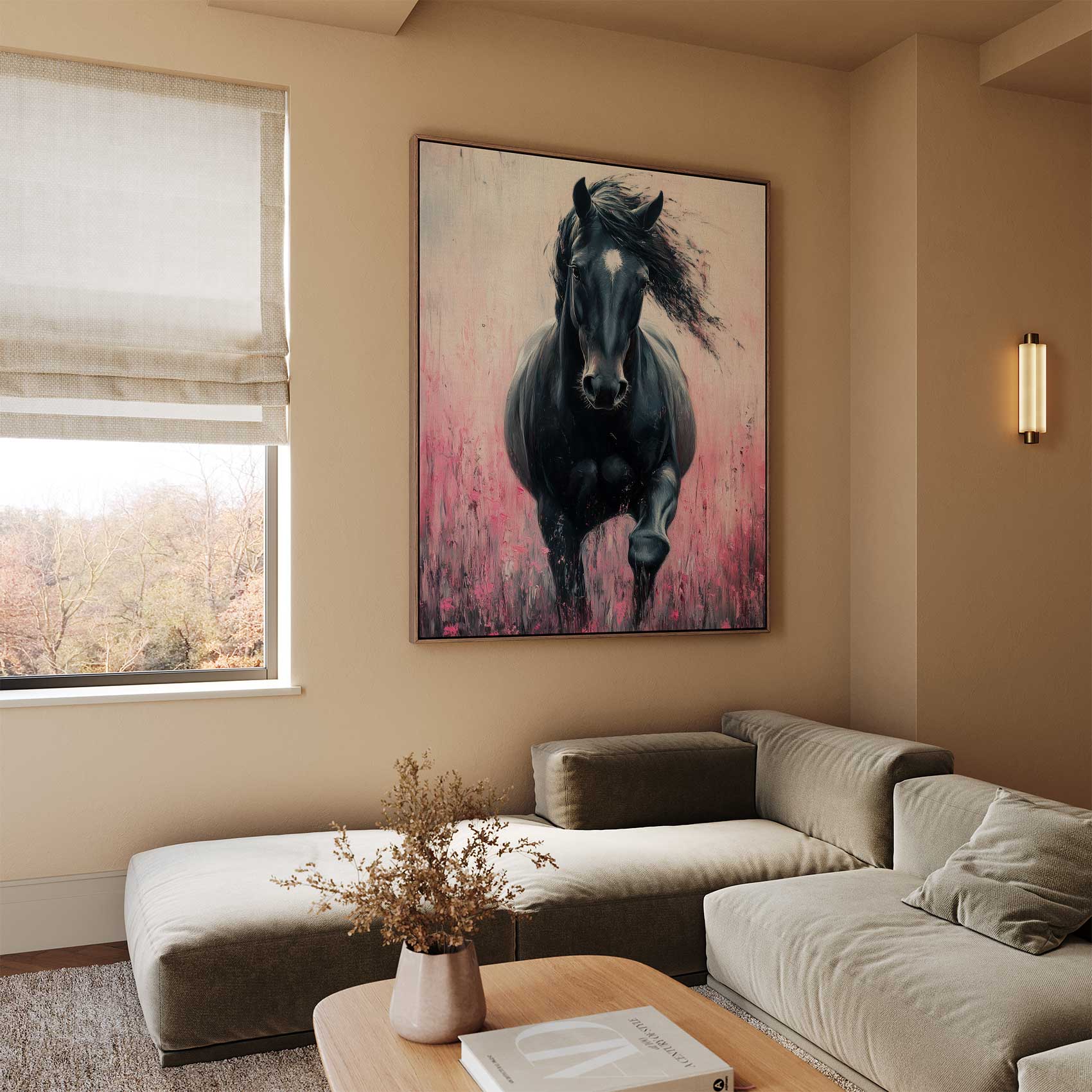 Zwart paard in roze bloemen